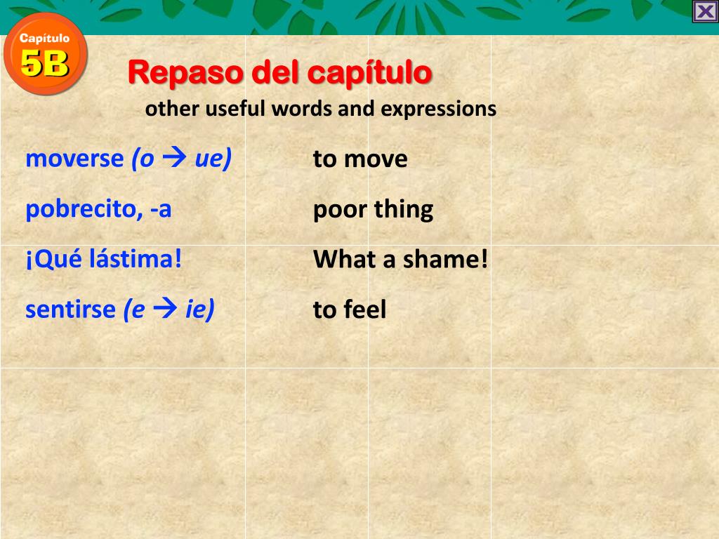 Repaso del capítulo other useful words and expressions moverse(o ue) pobrecito, -a ¡Quélástima! sentirse(e ie) to move poor thing What a shame! to feel