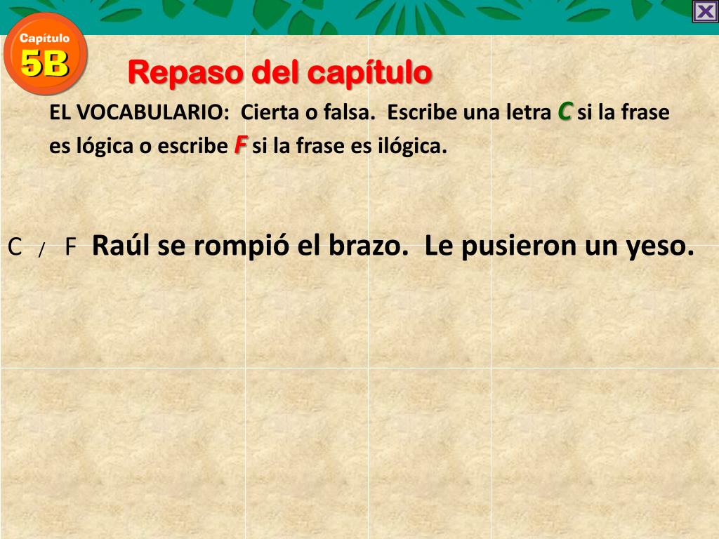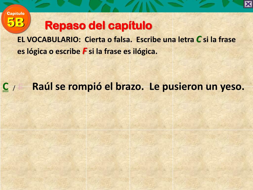 Repaso del capítulo EL VOCABULARIO: Cierta o falsa. EscribeunaletraCsi la frase eslógica o escribeFsi la fraseesilógica. C / FRaúl se rompió el brazo. Le pusieron un yeso.