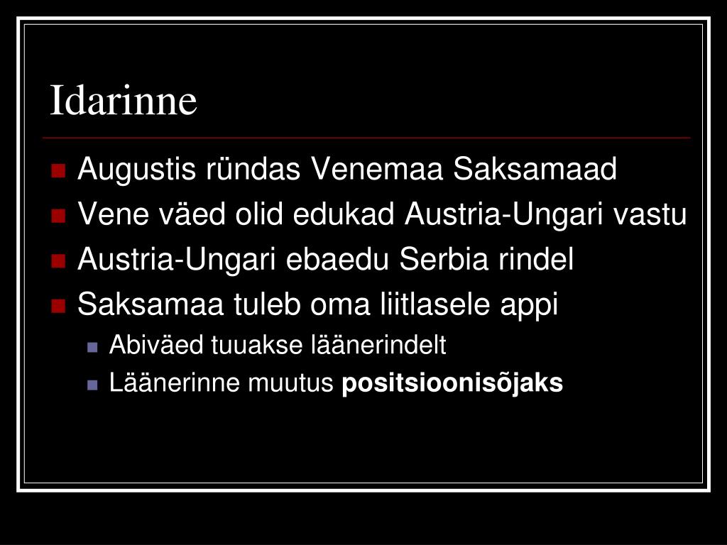 Idarinne • Augustis ründas Venemaa Saksamaad • Vene väed olid edukad Austria-Ungari vastu • Austria-Ungari ebaedu Serbia rindel • Saksamaa tuleb oma liitlasele appi • Abiväed tuuakse läänerindelt • Läänerinne muutus positsioonisõjaks