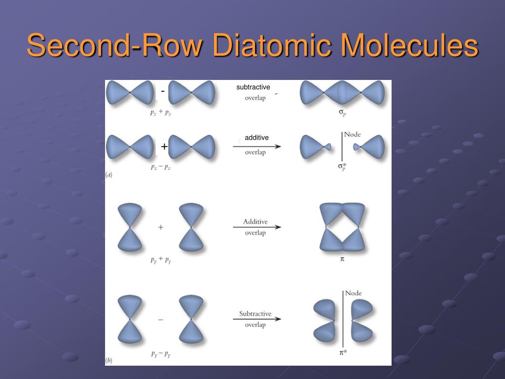 Orbital Mixing • In B2, the overlap of 2s and 2pz orbitals stabilizes ss and destabilizes sp • The amount of mixing depends on the energy difference between the 2s and 2p atomic orbitals. • Mixing is largest when the energies of the orbitals are nearly the same 2 cases: 1) Zave ≤ 7, 2) Zave > 7 (qualitative)