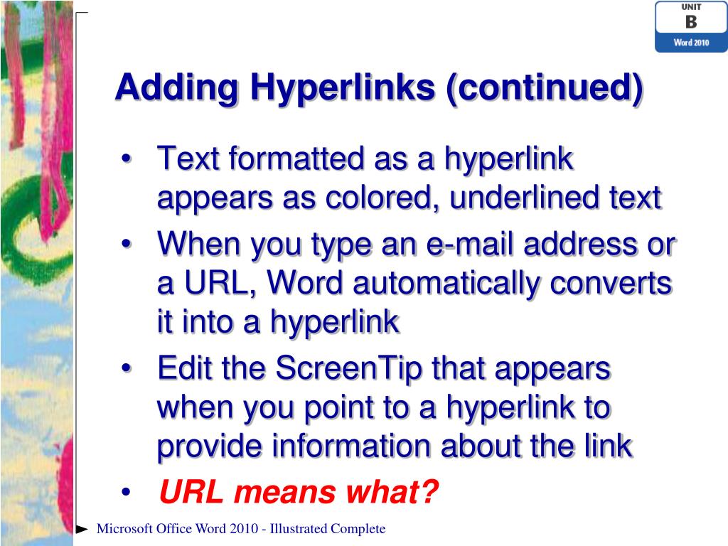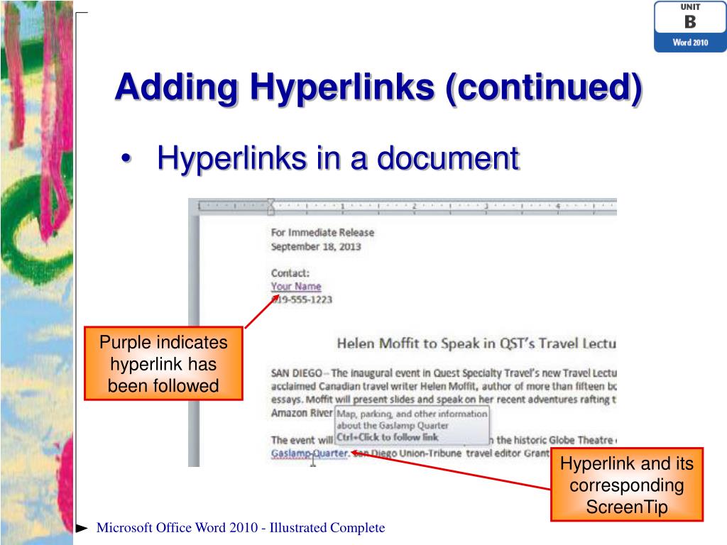 Adding Hyperlinks (continued) • Hyperlinks in a document Purple indicates hyperlink has been followed Hyperlink and its corresponding ScreenTip Microsoft Office Word 2010 - Illustrated Complete