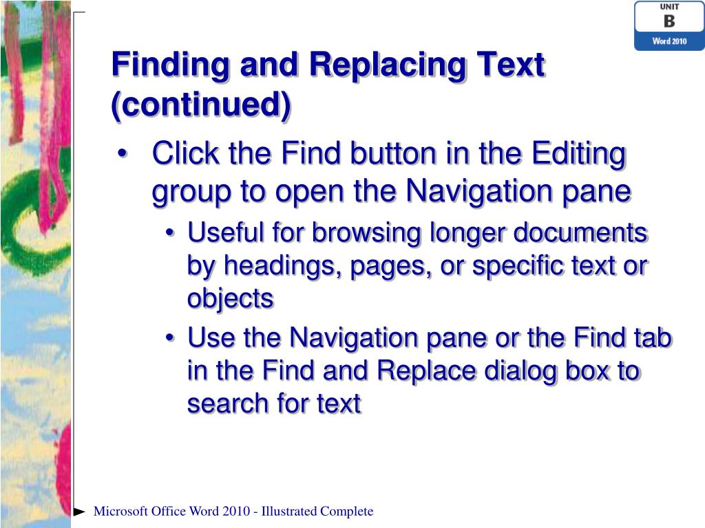 Finding and Replacing Text Page 33 Figure B-8 Navigation pane Search for text Found text is highlighted and selected Microsoft Office Word 2010 - Illustrated Complete