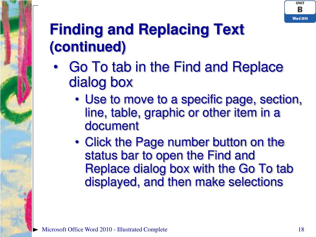 Finding and Replacing Text (continued) • Go To tab in the Find and Replace dialog box • Use to move to a specific page, section, line, table, graphic or other item in a document • Click the Page number button on the status bar to open the Find and Replace dialog box with the Go To tab displayed, and then make selections Microsoft Office Word 2010 - Illustrated Complete