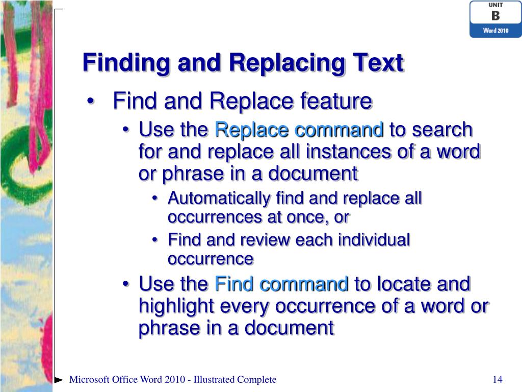 Microsoft Word 2010 - Illustrated. Unit B: Editing Documents. Objectives. Cut and paste text Copy and paste text Use the Office Clipboard Find and replace text. Objectives (continued). Check spelling and grammar Research information Add hyperlinks Work with document properties.