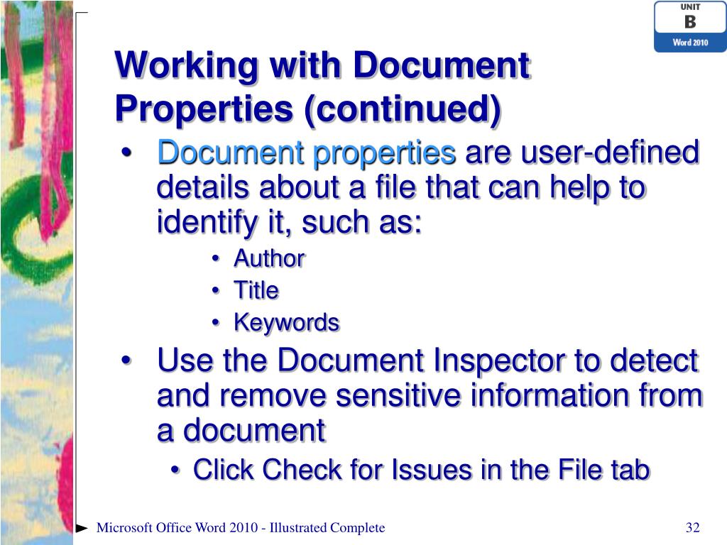 Working with Document Properties (continued) • Document properties are user-defined details about a file that can help to identify it, such as: • Author • Title • Keywords • Use the Document Inspector to detect and remove sensitive information from a document • Click Check for Issues in the File tab Microsoft Office Word 2010 - Illustrated Complete