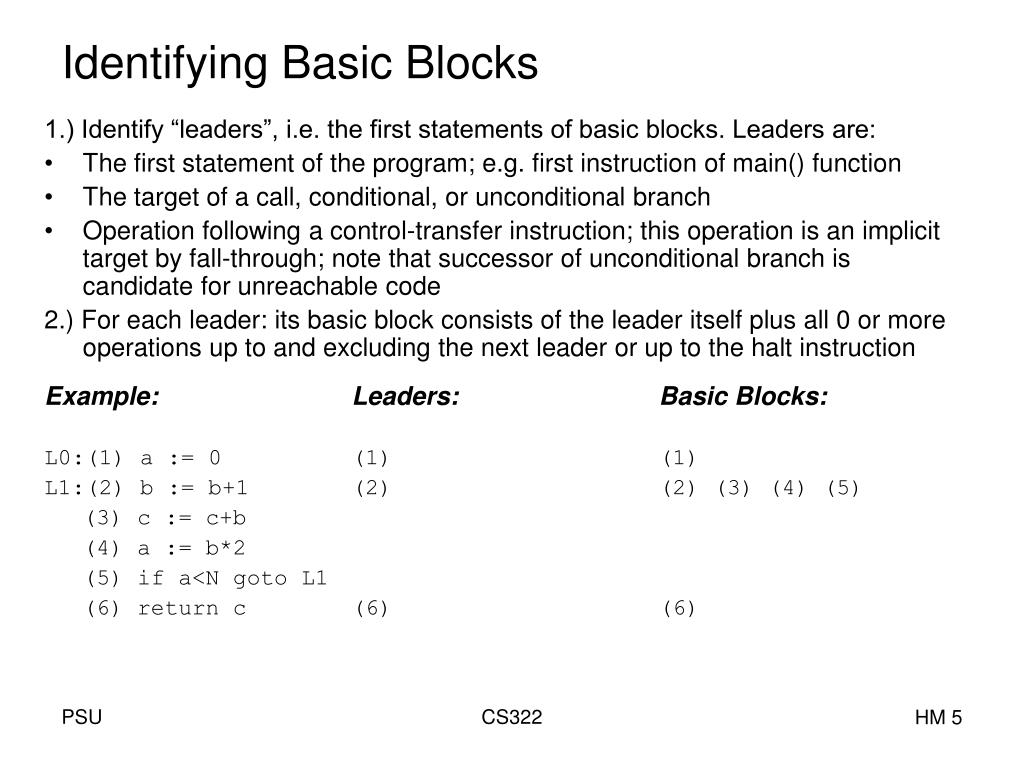 Definition: Basic Block A Basic Block (BB) is a sequence of 1 or more consecutive instructions, starting with a unique entry (header, aka leader) and ending with an exit instruction that transfers to another BB or ends the program (e.g. a Halt instruction) Possible to have single-instruction BBs. Leaders are explicitly created by being the destination of branch- and call destinations. Leaders are implicitly created by the previous instruction branching away (via jump or call), or by fall-though e.g. in the case of conditional branches CS322