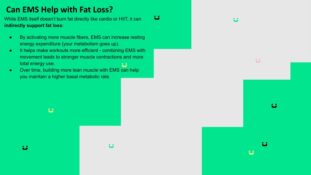 Can EMS Help with Fat Loss? While EMS itself doesn’t burn fat directly like cardio or HIIT, it can indirectly support fat loss: ● By activating more muscle fibers, EMS can increase resting energy expenditure (your metabolism goes up). It helps make workouts more efficient - combining EMS with movement leads to stronger muscle contractions and more total energy use. Over time, building more lean muscle with EMS can help you maintain a higher basal metabolic rate. ● ●