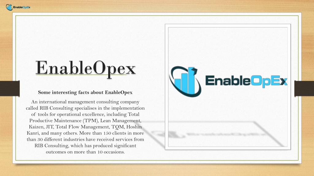 EnableOpex Some interesting facts about EnableOpex An international management consulting company called RIB Consulting specialises in the implementation of tools for operational excellence, including Total Productive Maintenance (TPM), Lean Management, Kaizen, JIT, Total Flow Management, TQM, Hoshin Kanri, and many others. More than 150 clients in more than 30 different industries have received services from RIB Consulting, which has produced significant outcomes on more than 10 occasions.