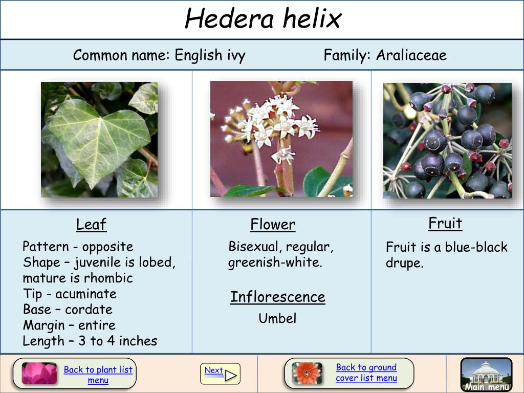 Hedera helix Leaf – Mature leaves are entire and rhombic in shape. Stems lack red coloration. Back to ground cover list menu Back to plant list menu Back Next Main menu