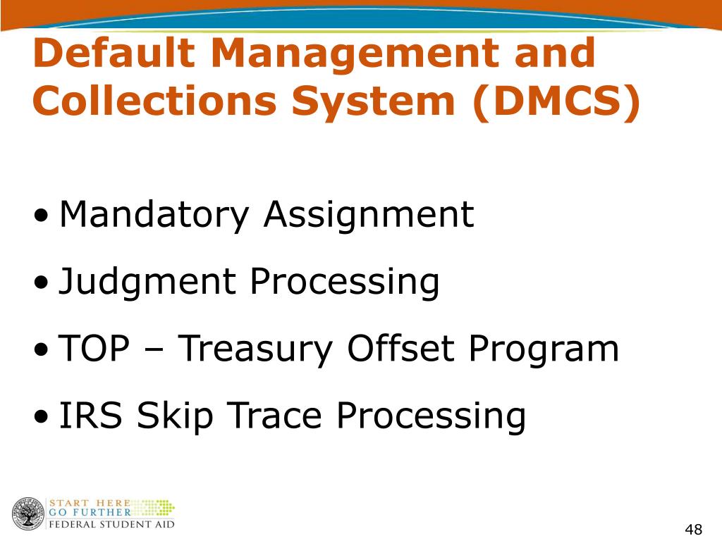 Default Management and Collections System (DMCS) • Mandatory Assignment • Judgment Processing • TOP – Treasury Offset Program • IRS Skip Trace Processing