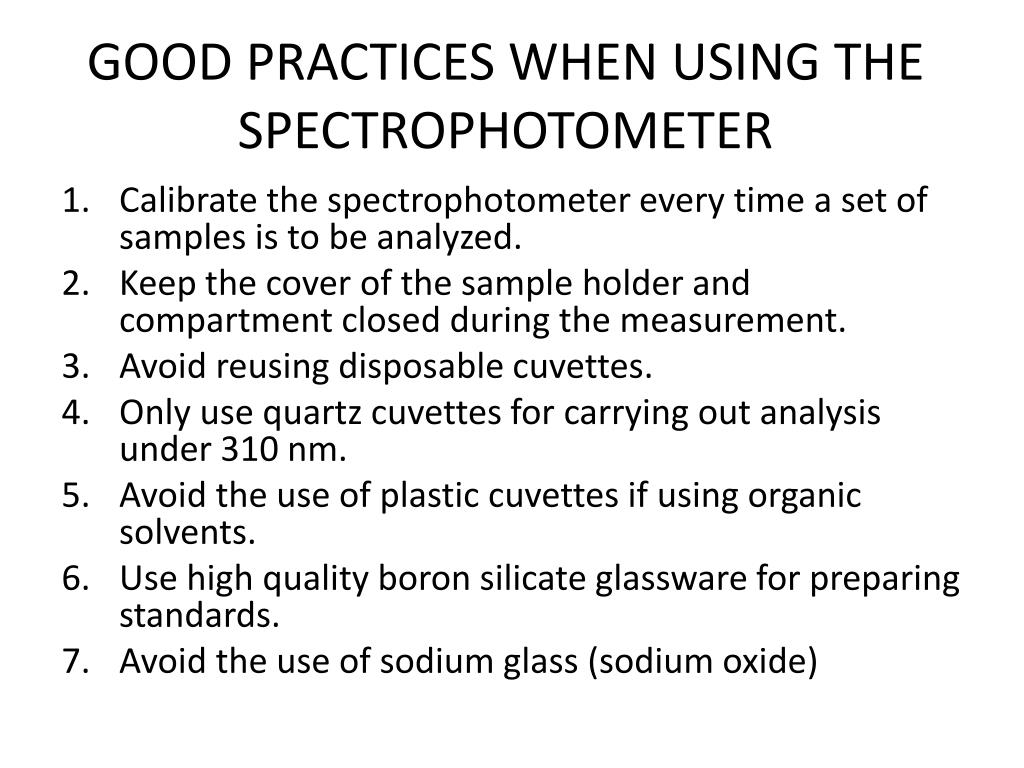 GOOD PRACTICES WHEN USING THE SPECTROPHOTOMETER • Calibrate the spectrophotometer every time a set of samples is to be analyzed. • Keep the cover of the sample holder and compartment closed during the measurement. • Avoid reusing disposable cuvettes. • Only use quartz cuvettes for carrying out analysis under 310 nm. • Avoid the use of plastic cuvettes if using organic solvents. • Use high quality boron silicate glassware for preparing standards. • Avoid the use of sodium glass (sodium oxide)