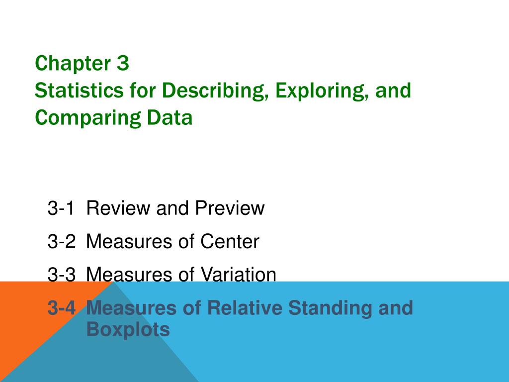 Chapter 3Statistics for Describing, Exploring, and Comparing Data 3-1 Review and Preview 3-2 Measures of Center 3-3 Measures of Variation 3-4 Measures of Relative Standing and Boxplots