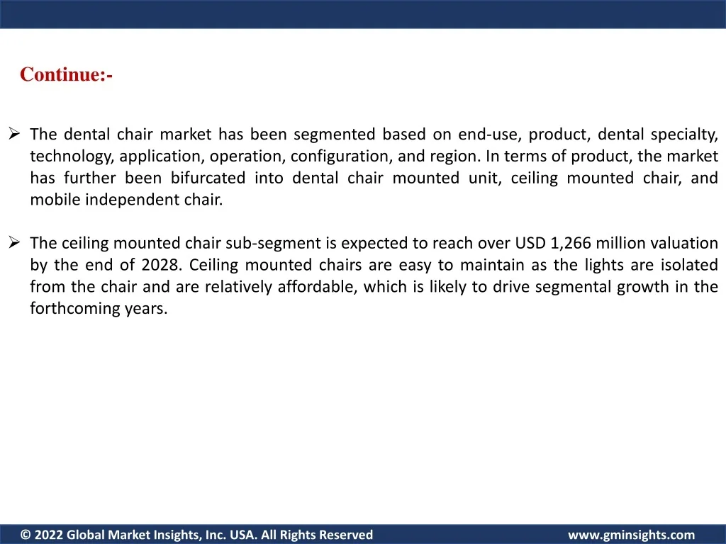 Continue:- • The dental chair market has been segmented based on end-use, product, dental specialty, technology, application, operation, configuration, and region. In terms of product, the market has further been bifurcated into dental chair mounted unit, ceiling mounted chair, and mobile independent chair. • The ceiling mounted chair sub-segment is expected to reach over USD 1,266 million valuation by the end of 2028. Ceiling mounted chairs are easy to maintain as the lights are isolated from the chair and are relatively affordable, which is likely to drive segmental growth in the forthcoming years. © 2022 Global Market Insights, Inc. USA. All Rights Reserved www.gminsights.com