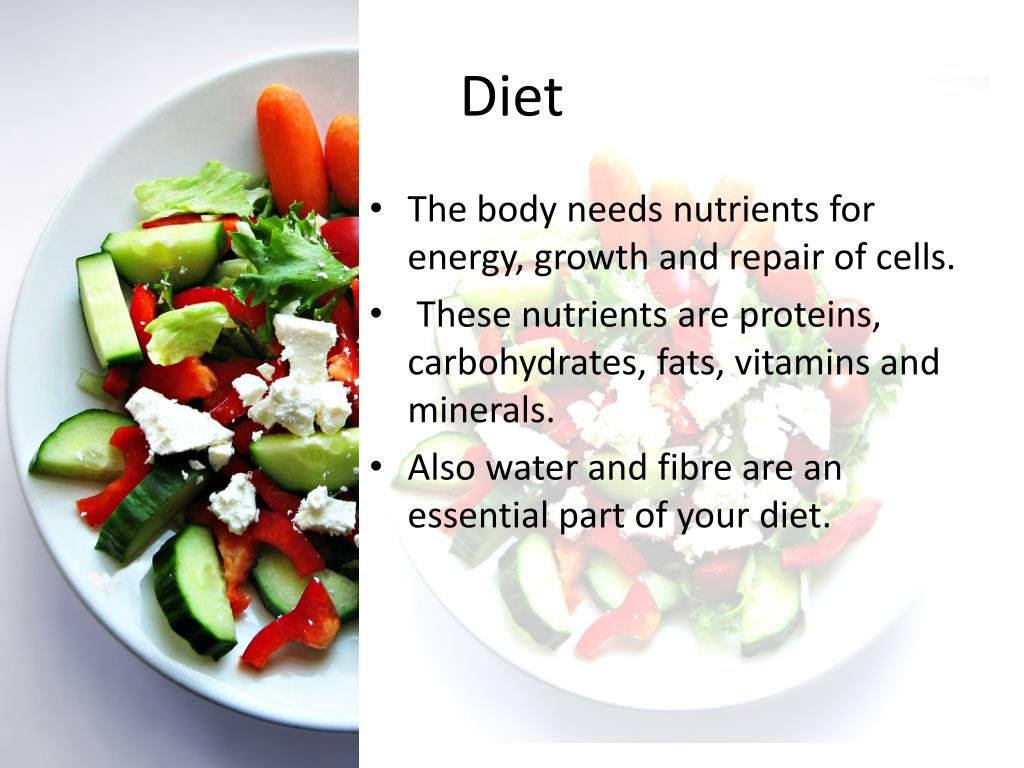 Diet. Diet. The body needs nutrients for energy, growth and repair of cells . These nutrients are proteins, carbohydrates , fats, vitamins and minerals. Also water and fibre are an essential part of your diet. Diet.