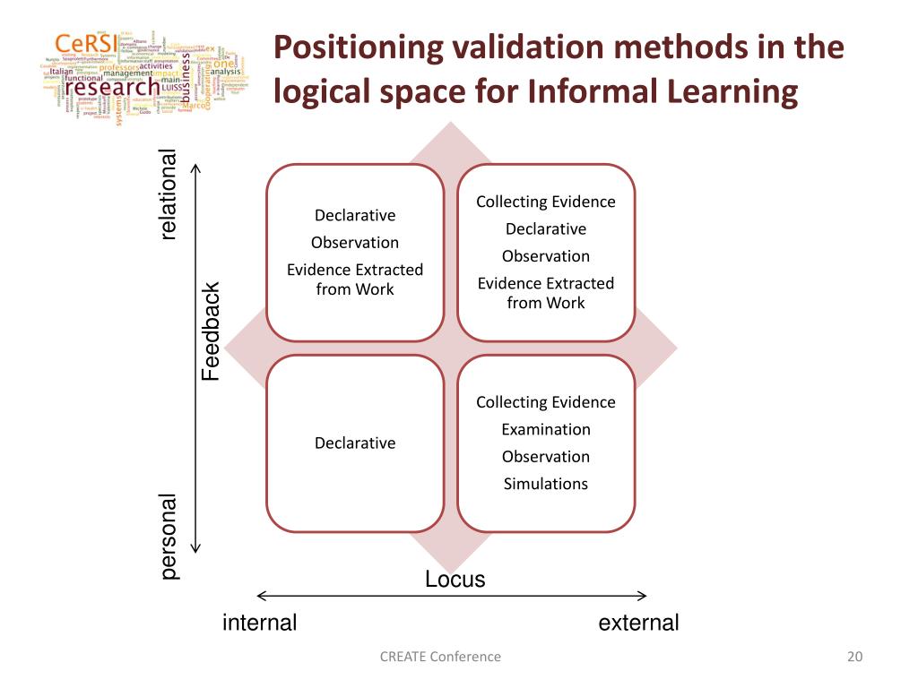 Positioning validation methods in the logical space for Informal Learning relational Feedback personal Locus internal external CREATE Conference