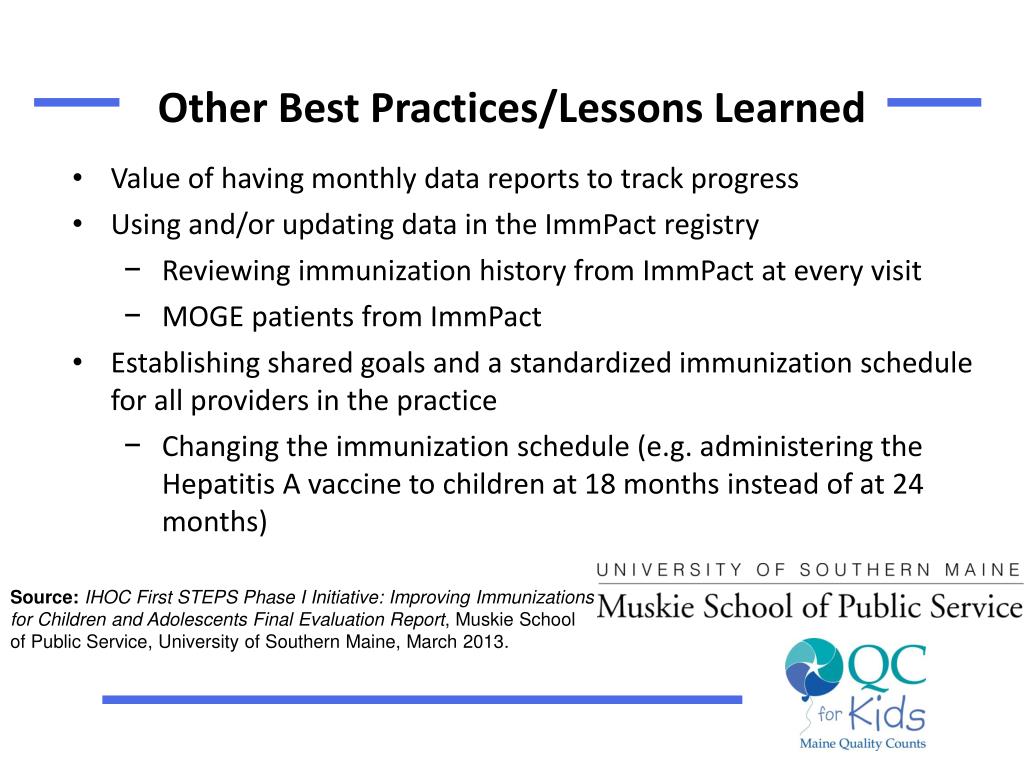 Other Best Practices/Lessons Learned Source:IHOC First STEPS Phase I Initiative: Improving Immunizations for Children and Adolescents Final Evaluation Report, Muskie School of Public Service, University of Southern Maine, March 2013. • Value of having monthly data reports to track progress • Using and/or updating data in the ImmPact registry • Reviewing immunization history from ImmPact at every visit • MOGEpatients from ImmPact • Establishing shared goals and a standardized immunization schedule for all providers in the practice • Changing the immunization schedule (e.g. administering the Hepatitis A vaccine to children at 18 months instead of at 24 months)