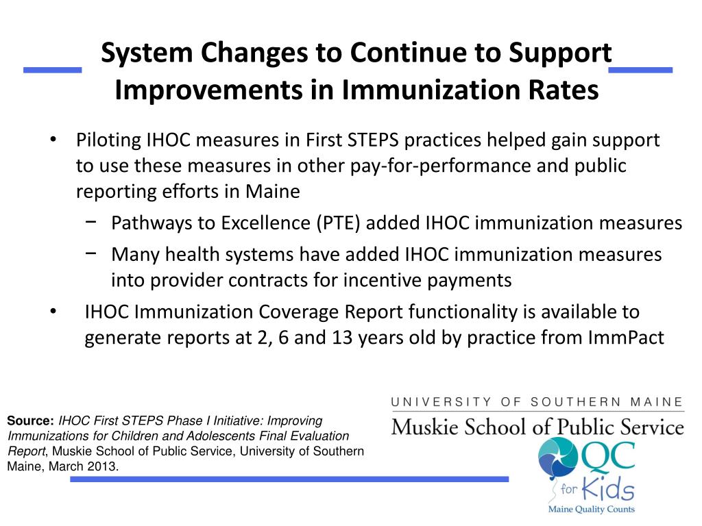 System Changes to Continue to Support Improvements in Immunization Rates Source:IHOC First STEPS Phase I Initiative: Improving Immunizations for Children and Adolescents Final Evaluation Report, Muskie School of Public Service, University of Southern Maine, March 2013. • Piloting IHOC measures in First STEPS practices helped gain support to use these measures in other pay-for-performance and public reporting efforts in Maine • Pathways to Excellence (PTE) added IHOC immunization measures • Many health systems have added IHOC immunization measures into provider contracts for incentive payments • IHOC Immunization Coverage Report functionality is available to generate reports at 2, 6 and 13 years old by practice from ImmPact