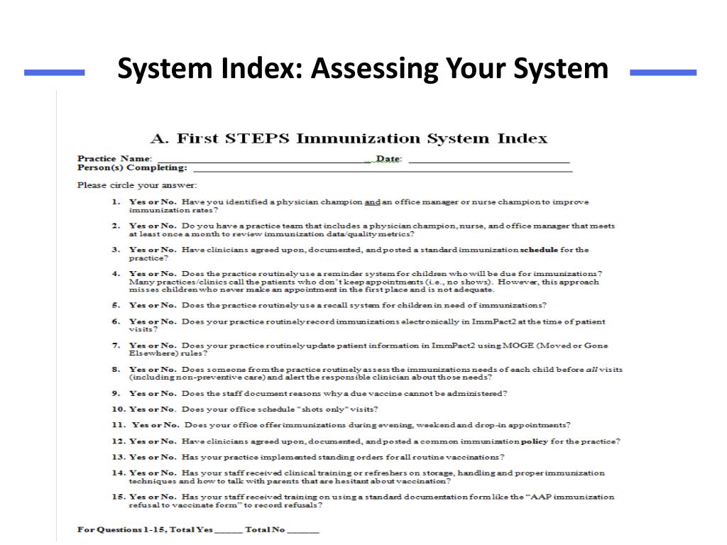Significant Changes in Immunization-Related Office Systems Source:IHOC First STEPS Phase I Initiative: Improving Immunizations for Children and Adolescents Final Evaluation Report, Muskie School of Public Service, University of Southern Maine, March 2013. • Training staff in how to discuss importance of vaccinations with hesitant patients/parents • Using recall and reminder systems for children due or past due for vaccinations • Routinely reviewing practice vaccination rates • Reviewing and updating ImmPact dose data • Reviewing ImmPact to identify vaccinations received at alternate sites