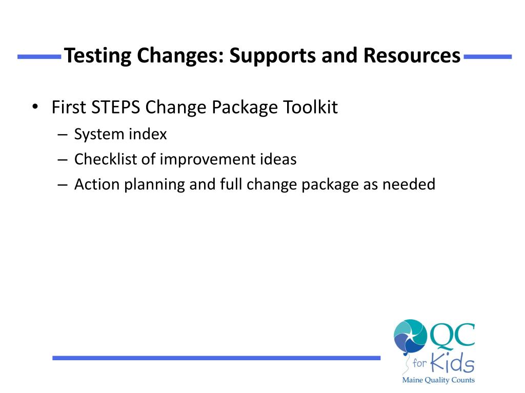 Testing Changes: Supports and Resources • First STEPS Change Package Toolkit • System index • Checklist of improvement ideas • Action planning and full change package as needed