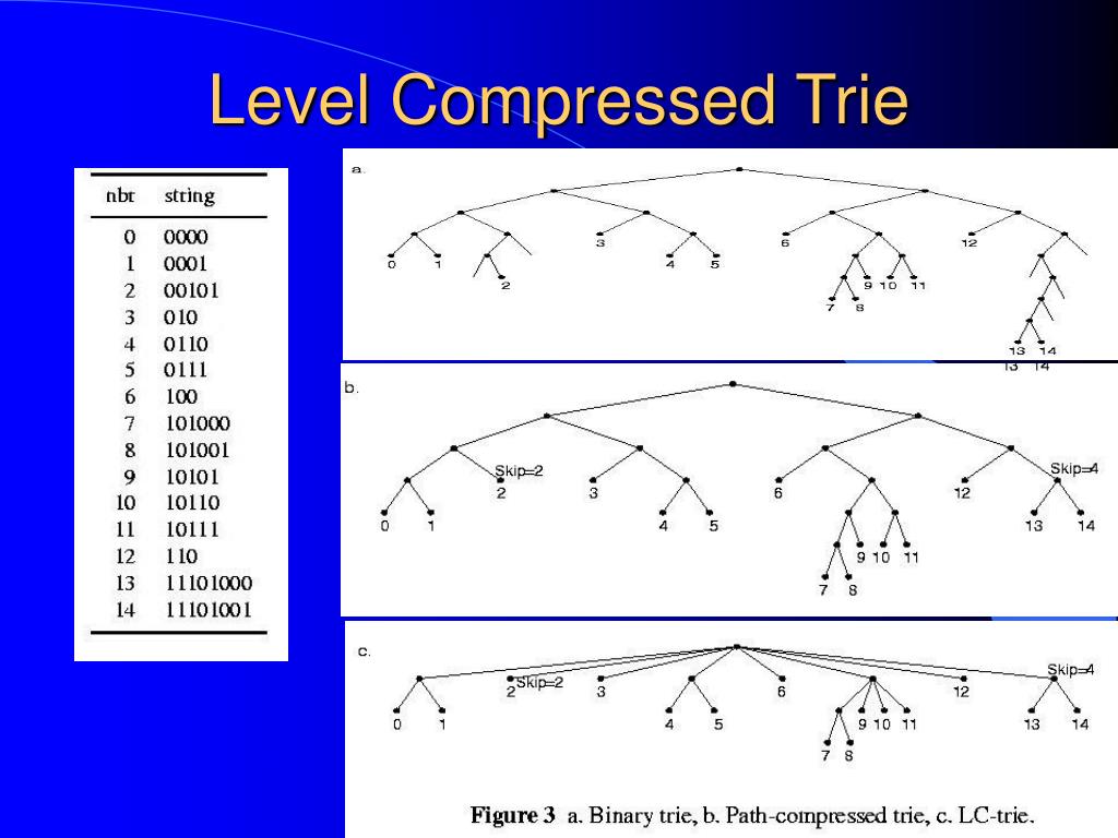References Marcel Waldvogel , et al., "Scalable High Speed IP Routing Lookups", ACM SIGCOMM '97 Pankaj Gupta, Steven Lin, and Nick McKeown , "Routing Lookups in Hardware at Memory Speeds." IEEE Infocom April 1998, San Francisco. George Varghese, "Fast Scalable Routing Lookups". Proceedings of ACM SIGCOMM, Sep 97. V.Srinivasan, "Faster IP Lookups using Controlled Prefix Expansion". Proceedings of ACM SIGMETRICS, Sep 98. B. Lampson, et al., "IP Lookups using Multiway and Multicolumn Search". Infocom 98. Mikael Degermark, et al., "Small Forwarding Tables for Fast Routing Lookups", ACM SIGCOMM '97 Andreas Moestedt, et al., "IP Address Lookup in Hardware for High-Speed Routing", Hot Interconnects, August 1998 Michigan University and Merit Network. Internet Performance Management and Analysis (IPMA) Project, http://nic.merit.edu/~ipma/.