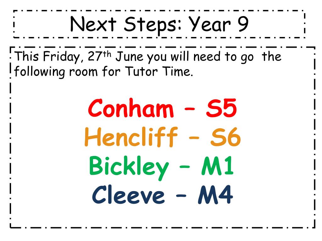 Next Steps: Year 9 This Friday, 27th June you will need to go the following room for Tutor Time. Conham – S5 Hencliff – S6 Bickley – M1 Cleeve – M4