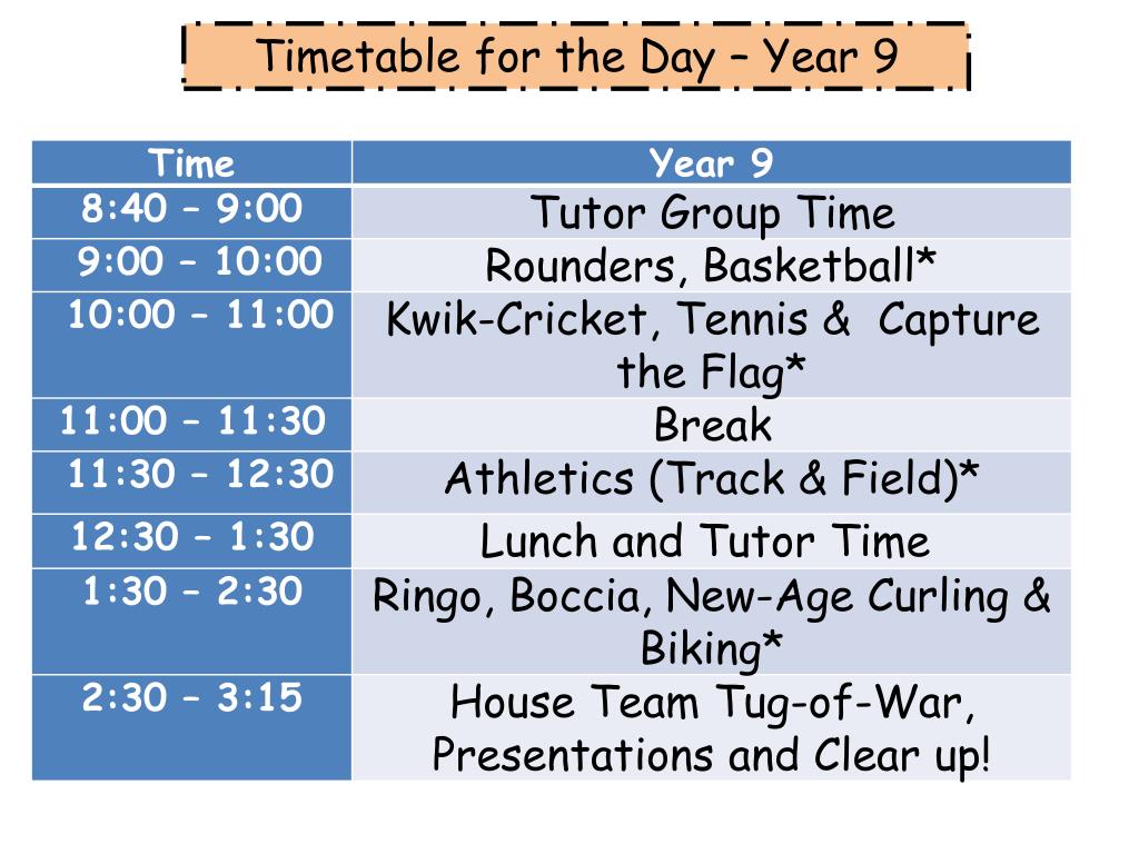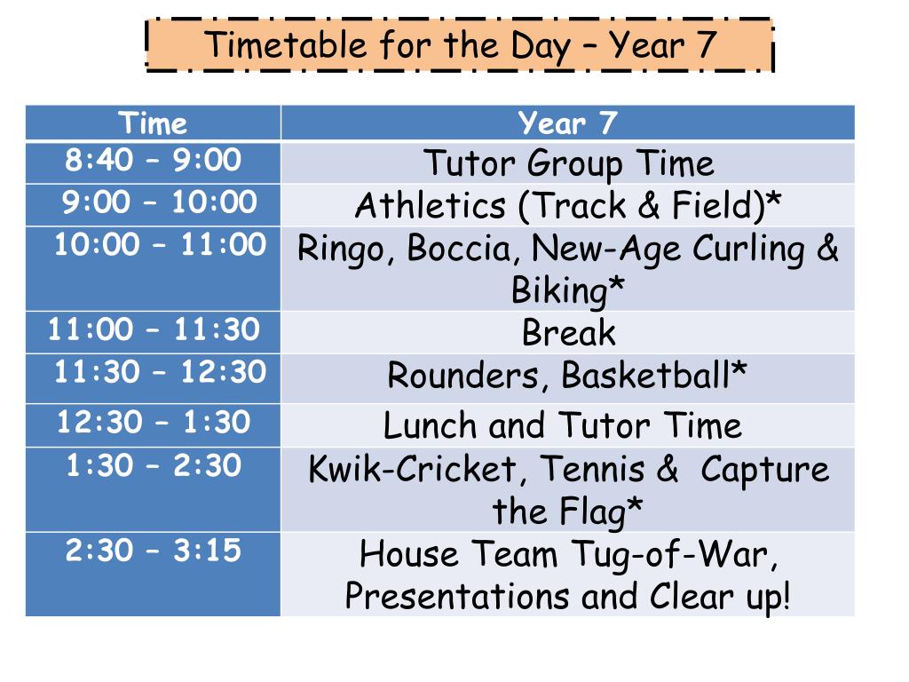 Arrangements • The day will start at 8.40 within Tutor Bases (you will be informed of a room beforehand). • From 9.00 there will be a carousel of activities. All pupils will do the same activities but at different times throughout the day. • All students are encouraged to participate in as many events as possible. • You will need to come to school in PE kit, but you can wear clothing suitable in the colour of your house.