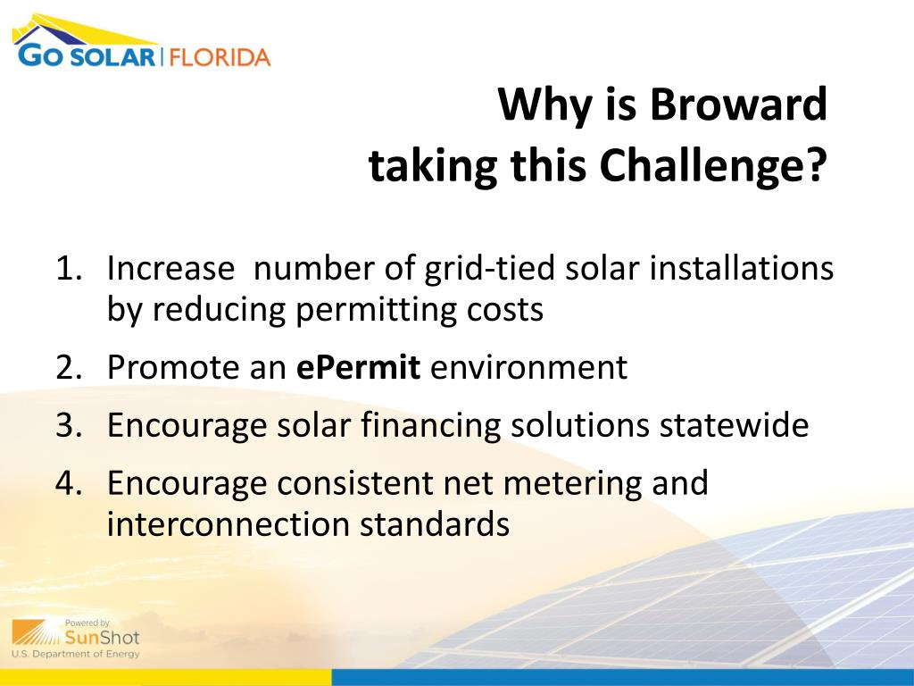 Why is Browardtaking this Challenge? Increase number of grid-tied solar installations by reducing permitting costs Promote an ePermit environment Encourage solar financing solutions statewide Encourage consistent net metering and interconnection standards