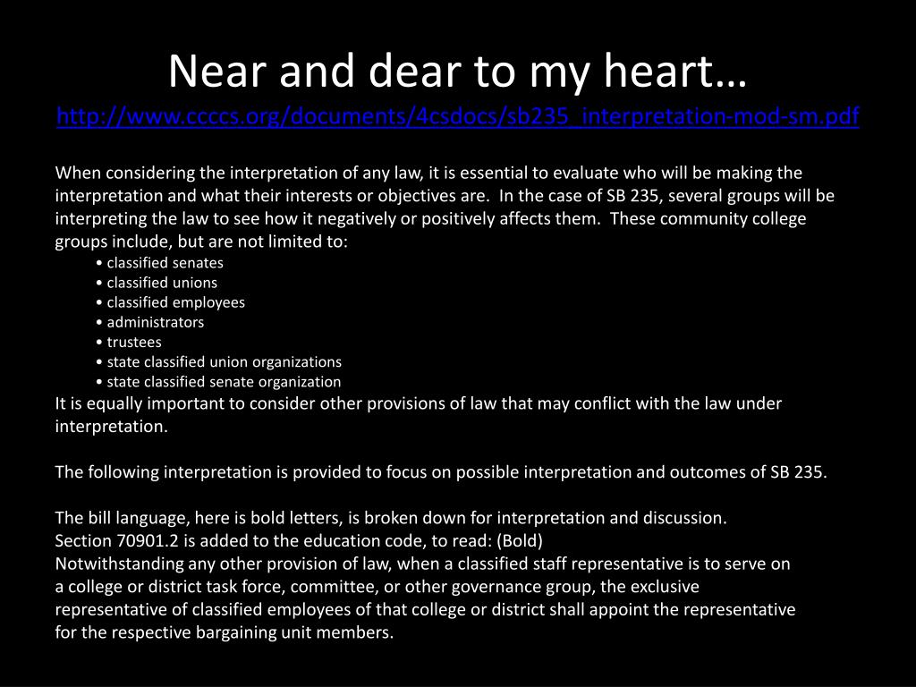 Near and dear to my heart…http://www.ccccs.org/documents/4csdocs/sb235_interpretation-mod-sm.pdf When considering the interpretation of any law, it is essential to evaluate who will be making the interpretation and what their interests or objectives are. In the case of SB 235, several groups will be interpreting the law to see how it negatively or positively affects them. These community college groups include, but are not limited to: • classified senates • classified unions • classified employees • administrators • trustees • state classified union organizations • state classified senate organization It is equally important to consider other provisions of law that may conflict with the law under interpretation. The following interpretation is provided to focus on possible interpretation and outcomes of SB 235. The bill language, here is bold letters, is broken down for interpretation and discussion. Section 70901.2 is added to the education code, to read: (Bold) Notwithstanding any other provision of law, when a classified staff representative is to serve on a college or district task force, committee, or other governance group, the exclusive representative of classified employees of that college or district shall appoint the representative for the respective bargaining unit members.