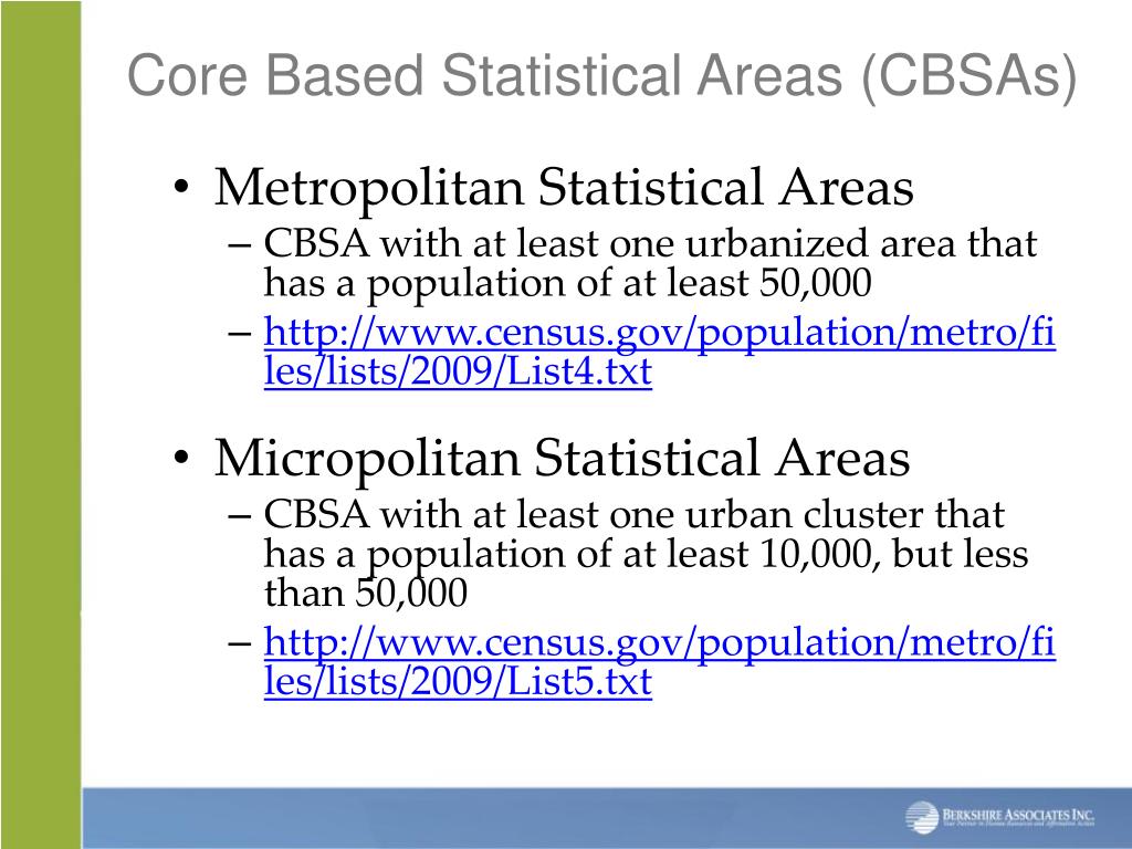 Core Based Statistical Areas (CBSAs) A statistical geographic entity consisting of the county or counties associated with at least one core (urbanized area or urban cluster) of at least 10,000 population, plus adjacent counties having a high degree of social and economic integration with the core as measured through commuting ties with the counties containing the core. Metropolitan and Micropolitan Statistical Areas are the two categories of Core Based Statistical Areas.
