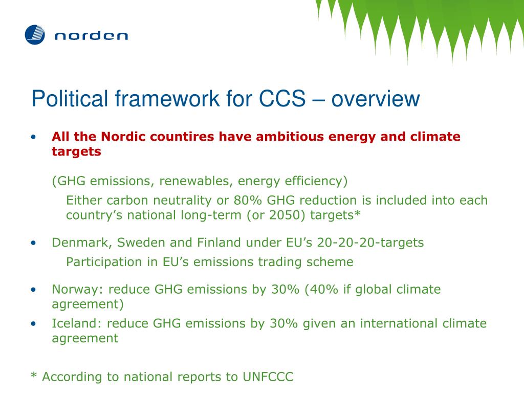 Political framework for CCS – overview • All the Nordic countires have ambitious energy and climate targets (GHG emissions, renewables, energy efficiency) • Either carbon neutrality or 80% GHG reduction is included into each country’s national long-term (or 2050) targets* • Denmark, Sweden and Finland under EU’s 20-20-20-targets • Participation in EU’s emissions trading scheme • Norway: reduce GHG emissions by 30% (40% if global climate agreement) • Iceland: reduce GHG emissions by 30% given an international climate agreement * According to national reports to UNFCCC