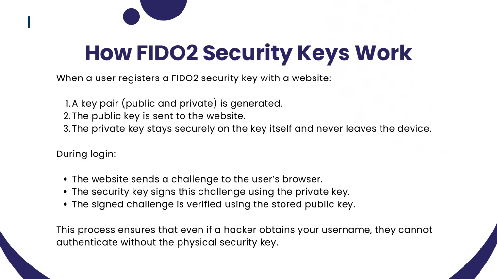 How FIDO2 Security Keys Work When a user registers a FIDO2 security key with a website: 1. 2. 3. A key pair (public and private) is generated. The public key is sent to the website. The private key stays securely on the key itself and never leaves the device. During login: The website sends a challenge to the user’s browser. The security key signs this challenge using the private key. The signed challenge is verified using the stored public key. This process ensures that even if a hacker obtains your username, they cannot authenticate without the physical security key.