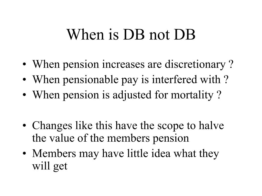 When is DB not DB • When pension increases are discretionary ? • When pensionable pay is interfered with ? • When pension is adjusted for mortality ? • Changes like this have the scope to halve the value of the members pension • Members may have little idea what they will get