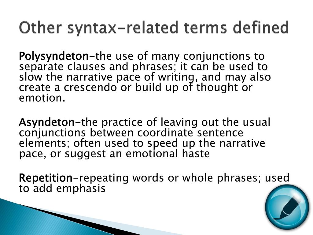 Other syntax-related terms defined Polysyndeton-the use of many conjunctions to separate clauses and phrases; it can be used to slow the narrative pace of writing, and may also create a crescendo or build up of thought or emotion. Asyndeton-the practice of leaving out the usual conjunctions between coordinate sentence elements; often used to speed up the narrative pace, or suggest an emotional haste Repetition-repeating words or whole phrases; used to add emphasis