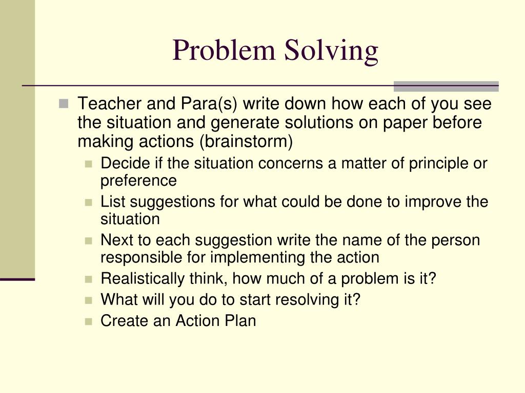 Problem Solving • Teacher and Para(s) write down how each of you see the situation and generate solutions on paper before making actions (brainstorm) • Decide if the situation concerns a matter of principle or preference • List suggestions for what could be done to improve the situation • Next to each suggestion write the name of the person responsible for implementing the action • Realistically think, how much of a problem is it? • What will you do to start resolving it? • Create an Action Plan
