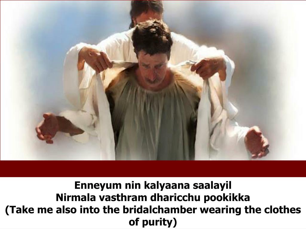 Enneyum nin kalyaana saalayil Nirmala vasthram dharicchu pookikka (Take me also into the bridalchamber wearing the clothes of purity)