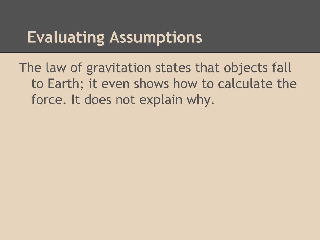 Evaluating Assumptions The law of gravitation states that objects fall to Earth; it even shows how to calculate the force. It does not explain why.