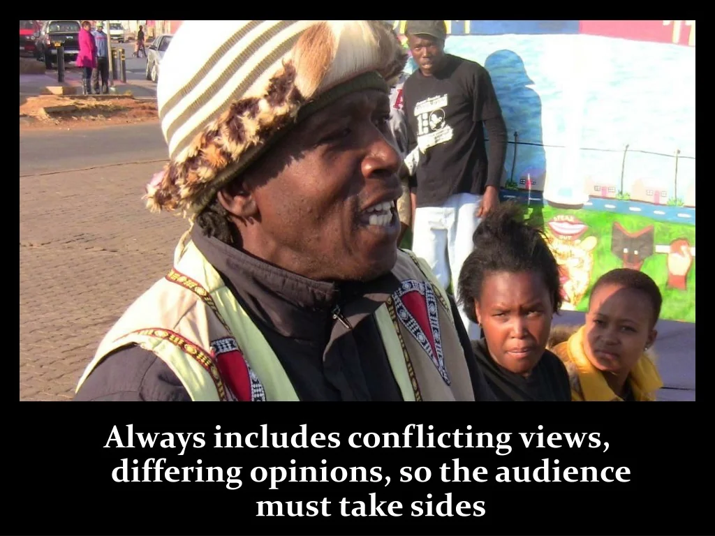 Always includes conflicting views, differing opinions, so the audience must take sides