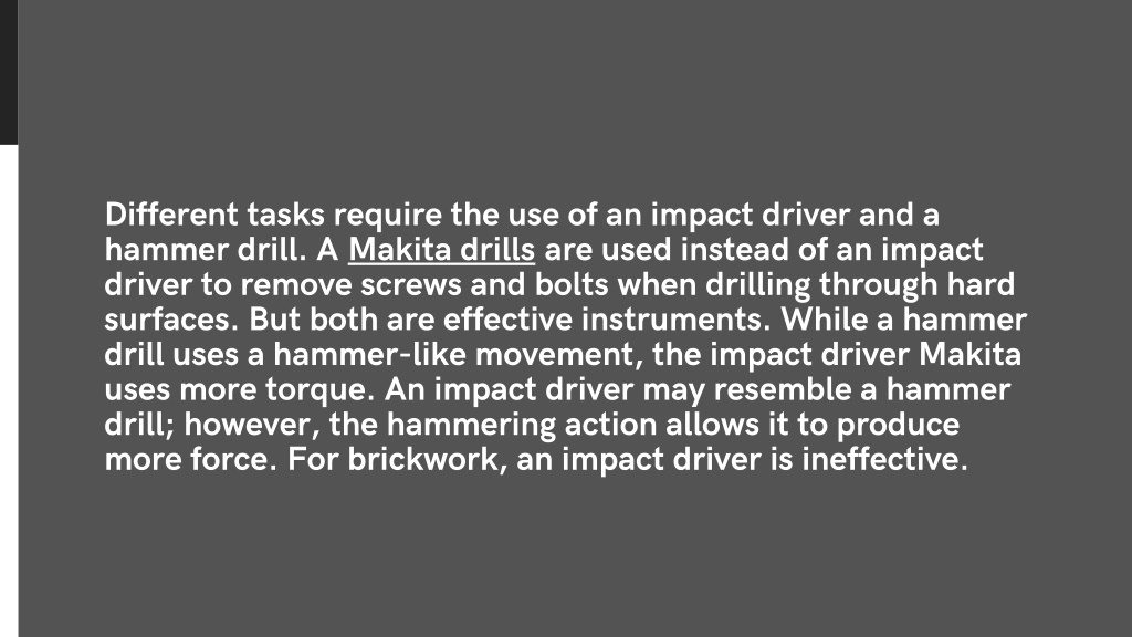 Different tasks require the use of an impact driver and a hammer drill. A Makita drills are used instead of an impact driver to remove screws and bolts when drilling through hard surfaces. But both are effective instruments. While a hammer drill uses a hammer-like movement, the impact driver Makita uses more torque. An impact driver may resemble a hammer drill; however, the hammering action allows it to produce more force. For brickwork, an impact driver is ineffective.