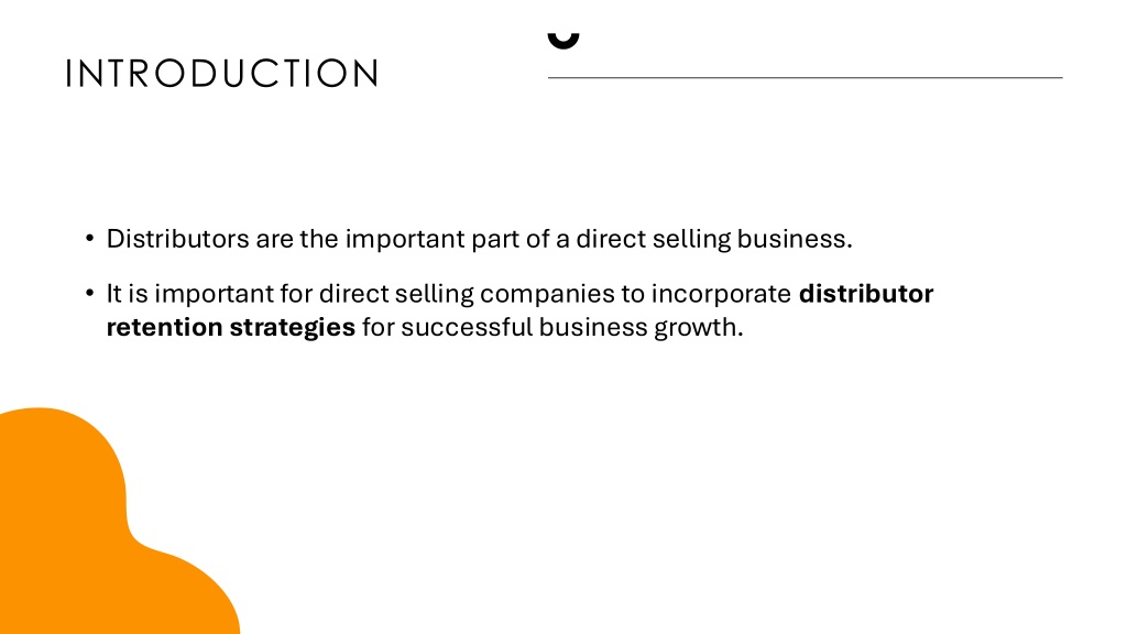 INTRODUCTION • Distributors are the important part of a direct selling business. • It is important for direct selling companies to incorporate distributor retention strategies for successful business growth.