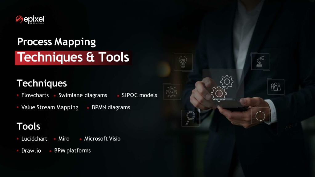 Process Mapping Techniques & Tools Techniques Flowcharts Swimlane diagrams SIPOC models Value Stream Mapping BPMN diagrams Tools Miro Microsoft Visio Lucidchart BPM platforms Draw.io
