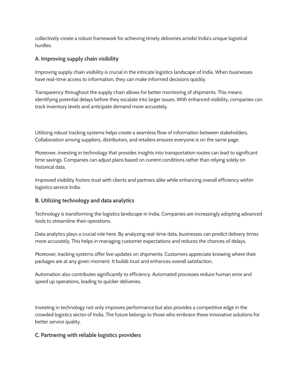 collectively create a robust framework for achieving timely deliveries amidst India's unique logistical hurdles. A. Improving supply chain visibility Improving supply chain visibility is crucial in the intricate logistics landscape of India. When businesses have real-time access to information, they can make informed decisions quickly. Transparency throughout the supply chain allows for better monitoring of shipments. This means identifying potential delays before they escalate into larger issues. With enhanced visibility, companies can track inventory levels and anticipate demand more accurately. Utilizing robust tracking systems helps create a seamless flow of information between stakeholders. Collaboration among suppliers, distributors, and retailers ensures everyone is on the same page. Moreover, investing in technology that provides insights into transportation routes can lead to significant time savings. Companies can adjust plans based on current conditions rather than relying solely on historical data. Improved visibility fosters trust with clients and partners alike while enhancing overall efficiency within logistics service India. B. Utilizing technology and data analytics Technology is transforming the logistics landscape in India. Companies are increasingly adopting advanced tools to streamline their operations. Data analytics plays a crucial role here. By analyzing real-time data, businesses can predict delivery times more accurately. This helps in managing customer expectations and reduces the chances of delays. Moreover, tracking systems offer live updates on shipments. Customers appreciate knowing where their packages are at any given moment. It builds trust and enhances overall satisfaction. Automation also contributes significantly to efficiency. Automated processes reduce human error and speed up operations, leading to quicker deliveries. Investing in technology not only improves performance but also provides a competitive edge in the crowded logistics sector of India. The future belongs to those who embrace these innovative solutions for better service quality. C. Partnering with reliable logistics providers
