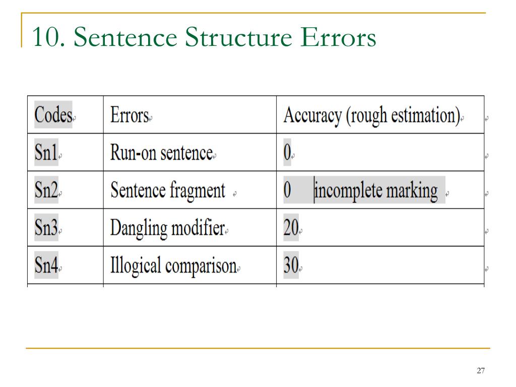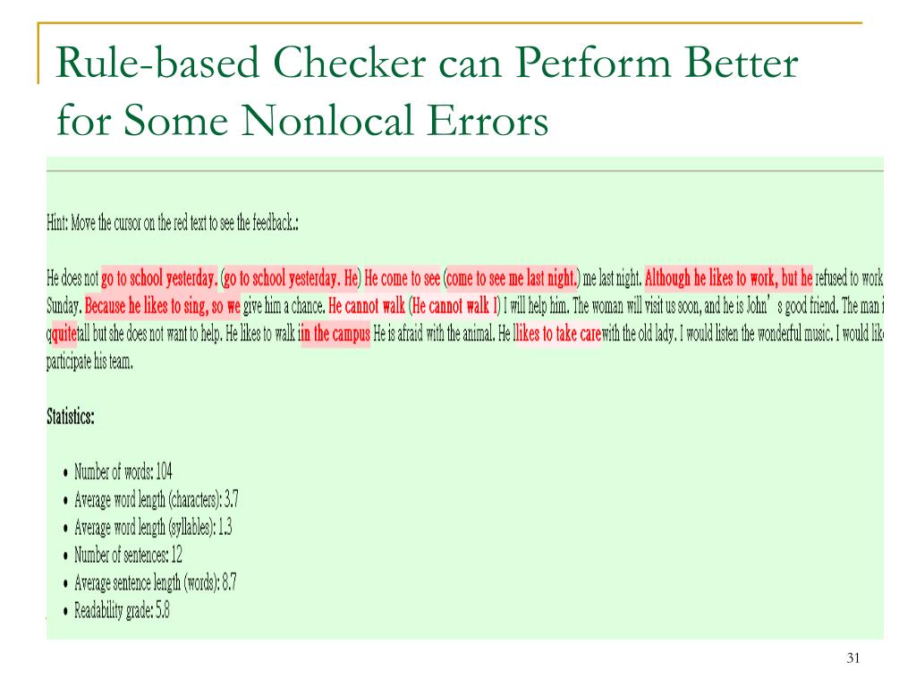 The Weakness of Ngram Checkers • It failed to catch the followings effectively: • Tense errors • Conjuncts errors • Fragments • Pronoun errors • Preposition errors • The run on sentences • The missing words