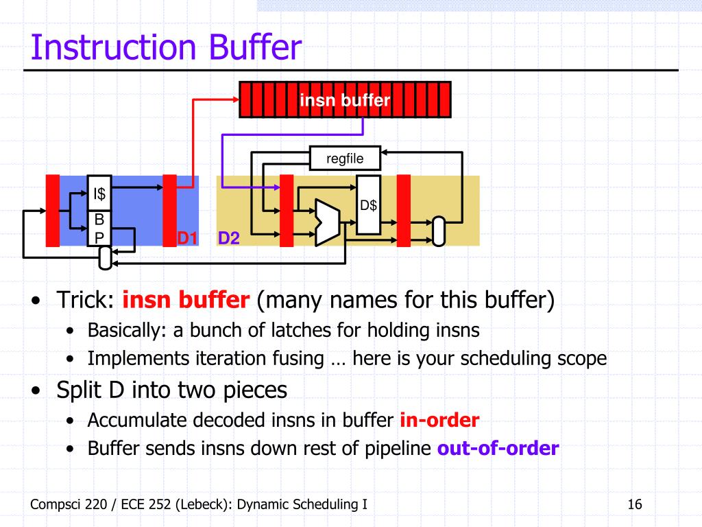Instruction Buffer insn buffer • Trick: insn buffer (many names for this buffer) • Basically: a bunch of latches for holding insns • Implements iteration fusing … here is your scheduling scope • Split D into two pieces • Accumulate decoded insns in buffer in-order • Buffer sends insns down rest of pipeline out-of-order regfile I$ D$ B P D1 D2 Compsci 220 / ECE 252 (Lebeck): Dynamic Scheduling I