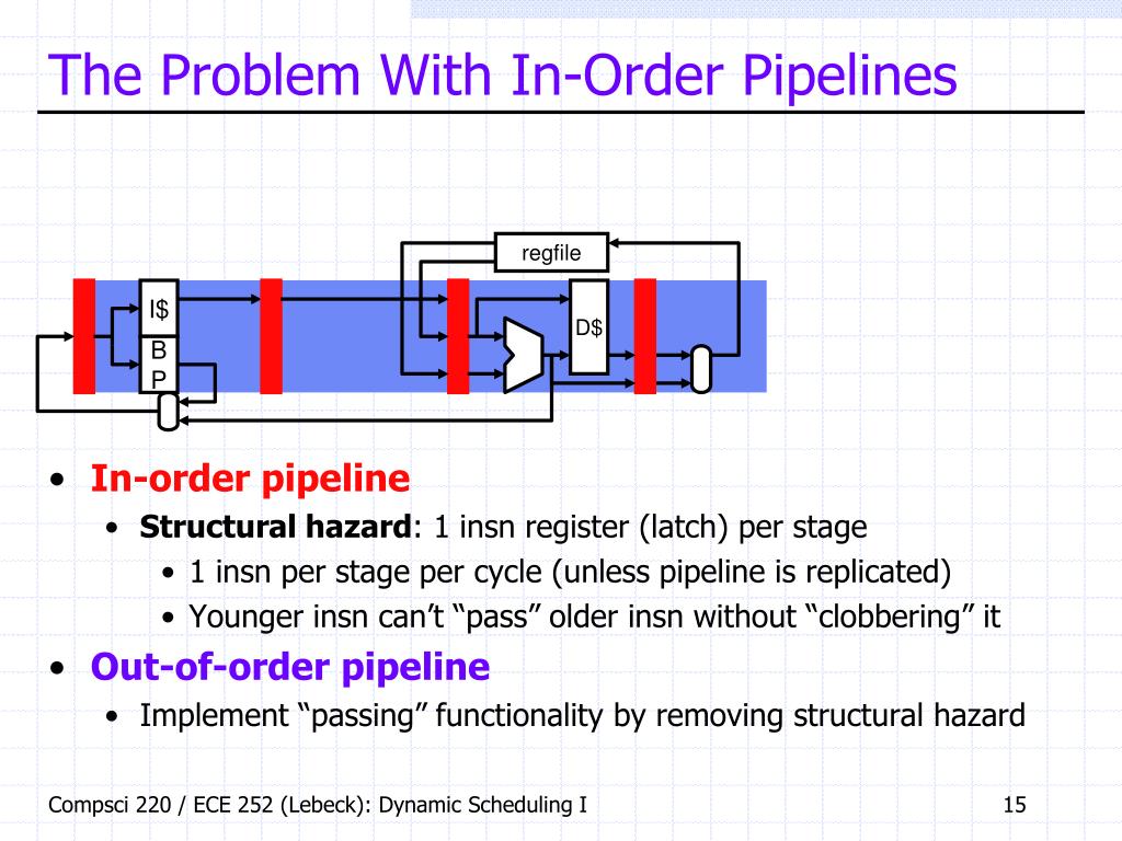 The Problem With In-Order Pipelines • In-order pipeline • Structural hazard: 1 insn register (latch) per stage • 1 insn per stage per cycle (unless pipeline is replicated) • Younger insn can’t “pass” older insn without “clobbering” it • Out-of-order pipeline • Implement “passing” functionality by removing structural hazard regfile I$ D$ B P Compsci 220 / ECE 252 (Lebeck): Dynamic Scheduling I