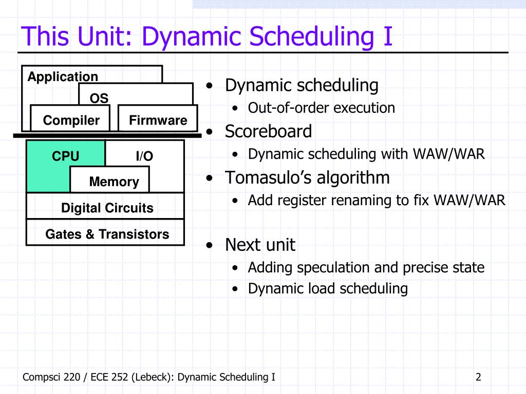 Duke Compsci 220 / ECE 252 Advanced Computer Architecture I. Prof. Alvin R. Lebeck Dynamic Scheduling I. Slides developed by Amir Roth of University of Pennsylvania with sources that included University of Wisconsin slides by Mark Hill, Guri Sohi , Jim Smith, and David Wood.