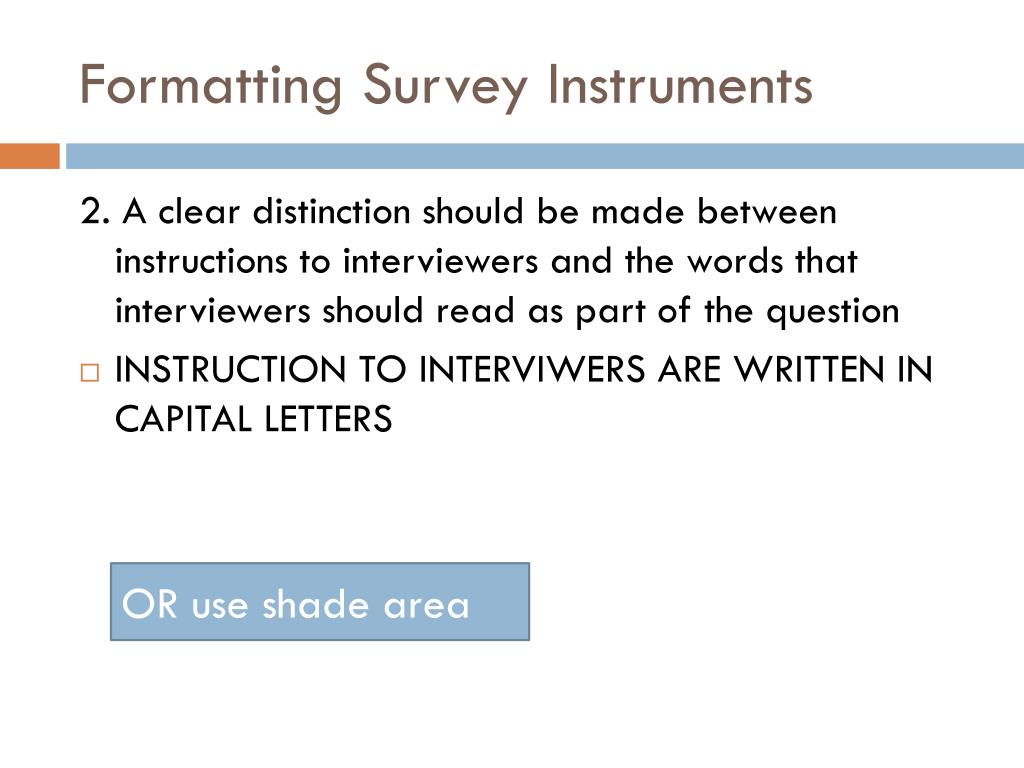 Formatting Survey Instruments 2. A clear distinction should be made between instructions to interviewers and the words that interviewers should read as part of the question • INSTRUCTION TO INTERVIWERS ARE WRITTEN IN CAPITAL LETTERS OR use shade area