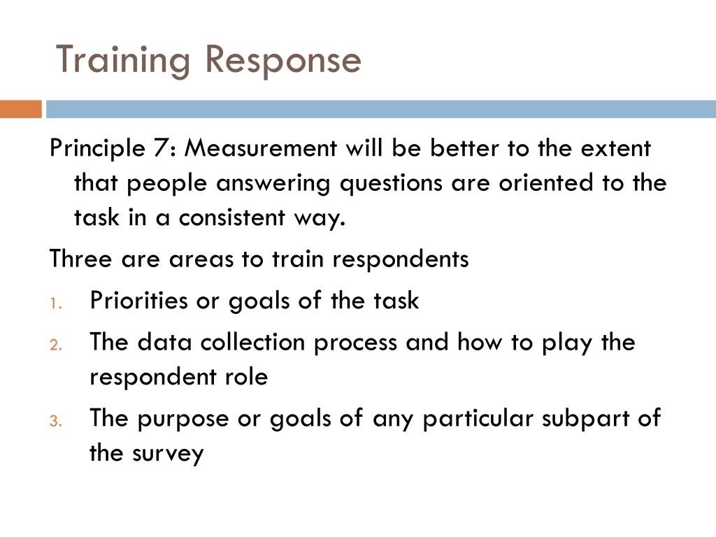 Training Response Principle 7: Measurement will be better to the extent that people answering questions are oriented to the task in a consistent way. Three are areas to train respondents • Priorities or goals of the task • The data collection process and how to play the respondent role • The purpose or goals of any particular subpart of the survey