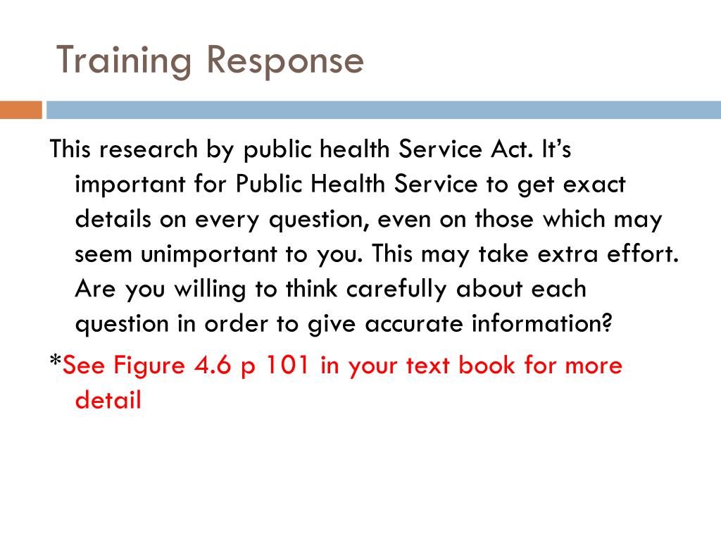 Training Response This research by public health Service Act. It’s important for Public Health Service to get exact details on every question, even on those which may seem unimportant to you. This may take extra effort. Are you willing to think carefully about each question in order to give accurate information? *See Figure 4.6 p 101 in your text book for more detail