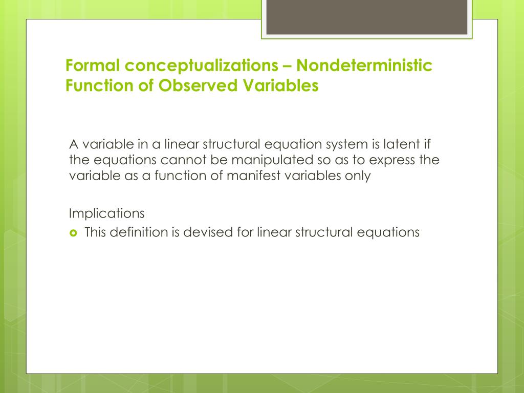 Formal conceptualizations – Nondeterministic Function of Observed Variables A variable in a linear structural equation system is latent if the equations cannot be manipulated so as to express the variable as a function of manifest variables only Implications • This definition is devised for linear structural equations