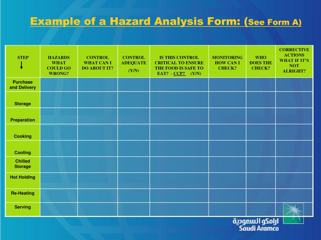 Example of a Hazard Analysis Form: (See Form A) Biological: - growth of bacteria. - cross contamination of bacteria from raw to ready to eat food. Physical - Pest contamination - Mold Chemical - Cleaning agents contamination - Pesticides
